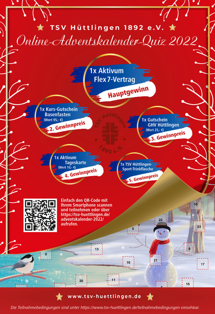 Neue Fragen – neues Glück! Nach dem tollen Feedback im Vorjahr gibt´s beim TSV Hüttlingen ab dem 01. Dezember 2022 wieder ein Online-Adventskalender-Quiz. Mitmachen lohnt sich in diesem Jahr wieder ganz besonders. Anlässlich seines 5. Geburtstages stellt das Sportvereinszentrum wertvolle Preise zur Verfügung. Es winken ein Flex 7-Vertrag (Hauptpreis), die Teilnahme an einem Basenfasten-Kurs und weitere wertvolle Preise. Mit dem Flex 7-Vertrag dürfen Sie 7 Monate lang kostenlos im Aktivum trainieren. Doch zuvor gilt es, Fragen rund um den TSV samt seiner Abteilungen und seiner Historie zu beantworten. Jeden Tag darf ein Türchen geöffnet und die sich dahinter versteckte Frage beantwortet werden. Jede richtige Antwort kommt in die Lostrommel und erhöht Ihre persönliche Gewinnchance.