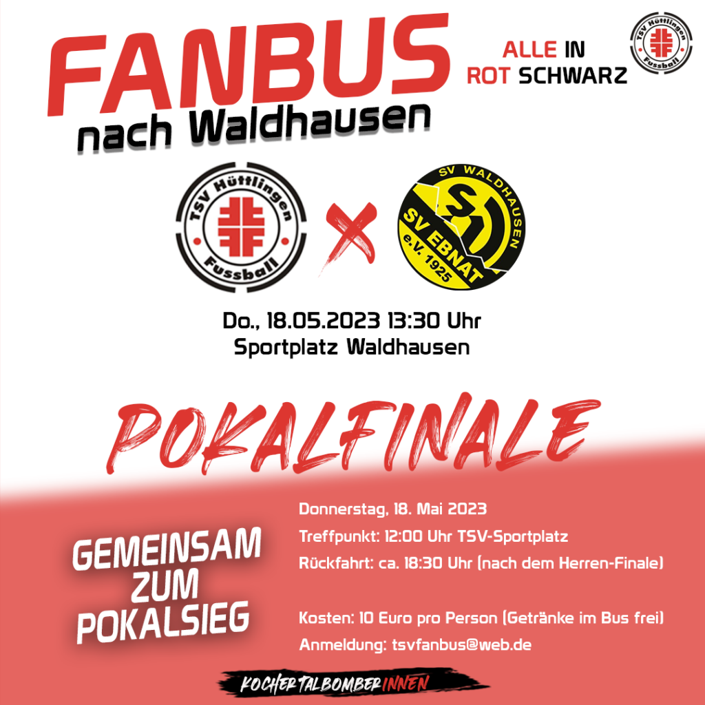 Die Mädels brauchen jede Unterstützung, um am Ende den Pokal mit nach Hüttlingen nehmen zu können. Deshalb wird ein Fanbus angeboten, der euch vom Sportplatz in Hüttlingen zum Pokalspiel und wieder zurück bringt. Inklusive Getränke und einer mega Stimmung! Lasst uns den Sportplatz rot-schwarz färben!