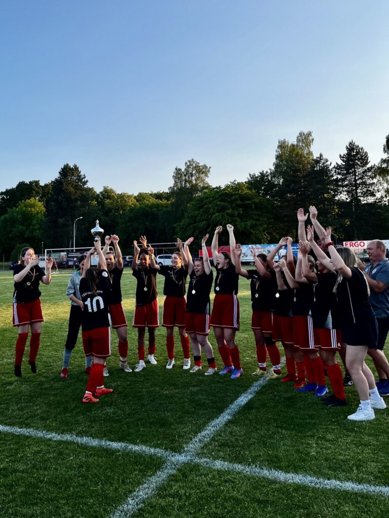 Die Zuschauer*innen erlebten nach Anpfiff ein anfangs unruhiges Spiel beider Mannschaften. Die chaotische Phase unserer Mädels wurde dann in der 18. Minute durch den Gegentreffer zum 1:0 bestraft. Im Anschluss sammelte sich unser TSV und erzielte noch vor dem Halbzeitpfiff den Ausgleichstreffer. Die zweite Halbzeit wurde dann weiter von unseren Hüttlinger B-Juniorinnen dominiert. Zwei weitere Treffer von Nevaeh Dikudi, die damit ihren Dreierpack perfekt machte, sowie ein Eigentor der Sontheimerinnen nach einem Eckball, unterstrichen diese Überlegenheit. Der verdiente Zwischenstand von 1:4 verleitete unsere Mädels zu unnötigen Unachtsamkeiten, die vom Gegner eiskalt mit einem Doppelschlag in der 68. und 69. Minute ausgenutzt wurden. Mit viel Einsatz und Teamgeist verteidigte unser Team die 3:4-Führung in den letzten zehn Minuten bis zum herbeigesehnten Abpfiff. Dann war die Freude riesig und die Spielerinnen, das Trainerteam sowie die mitgereisten Fans feierten gemeinsam diesen wohlverdienten, langersehnten Pokalsieg!