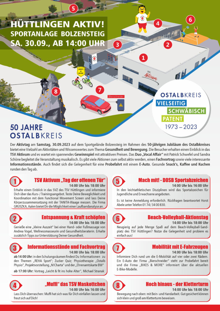 Rund ums Aktivum und der Sporthalle des TSV Hüttlingen ist am 30.09.2023 einiges geboten. Mitmachangebote für Groß und Klein, Alt und Jung und viele Infos zu Gesundheitsthemen sind zu erwarten: die Gemeinde Hüttlingen und der TSV Hüttlingen freuen sich auf regen Besuch!