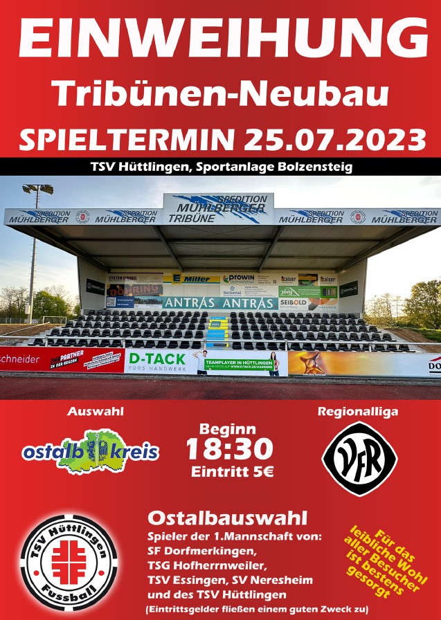« Alle Veranstaltungen Diese Veranstaltung hat bereits stattgefunden. Abt. Fußball – Einweihung Tribüne am 25.07.2023 25. Juli 2023 / 18:30 - 23:00 « Abt. Ski, Snow and Beach – Beach-Volleyball-Turnier Abt. Tennis: Jedermann – Jedefrau Turnier am 28./29. Juli 2023 » Zum Kalender hinzufügen Google Kalender iCalendar Outlook 365 Outlook Live Details Datum: 25. Juli 2023 Zeit: 18:30 - 23:00 Veranstalter Fußball Veranstaltungsort TSV Sportplatz Bärenhaldenweg 5 Hüttlingen, Baden-Württemberg 73460 Deutschland Google Karte anzeigen